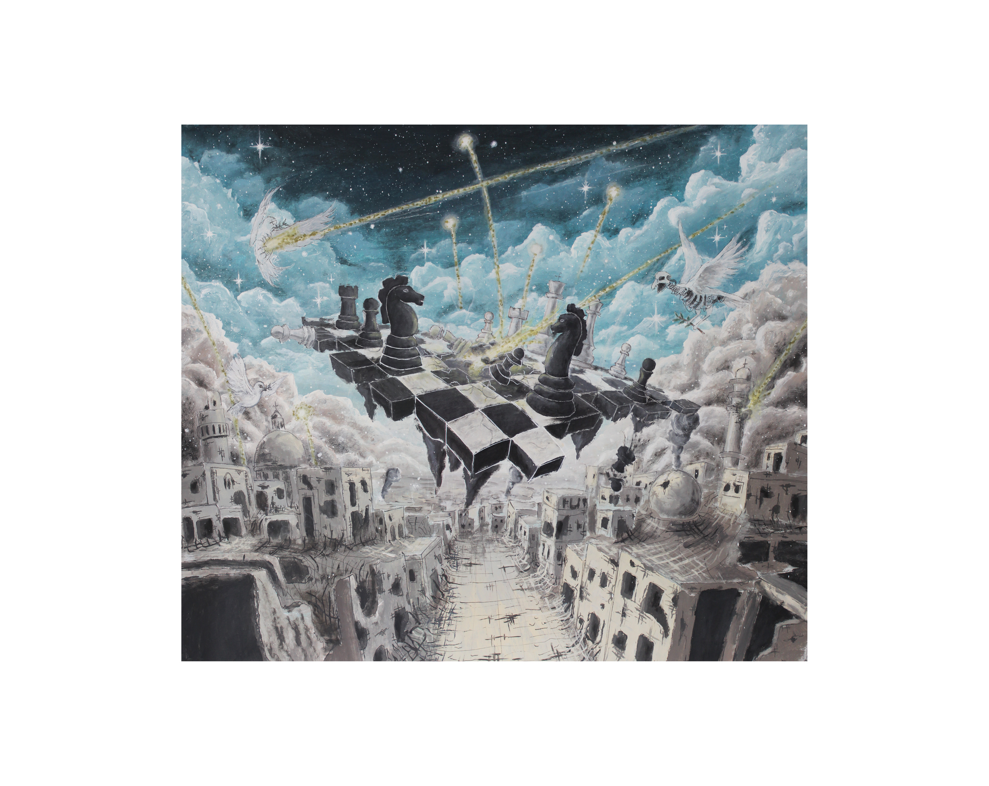 In Strategic Loss, the battlefield becomes a chessboard and human lives are reduced to calculated moves. A war-torn city lies beneath a floating grid of strategy — mechanical doves of peace caught in explosions, targeted like pieces in a game. Once symbols of hope, the doves now serve as pawns in a conflict driven by power and cold precision. This work critiques the dehumanization inherent in modern warfare, where civilian casualties are written off as “acceptable losses” — anticipated, rationalized, and ultimately ignored.