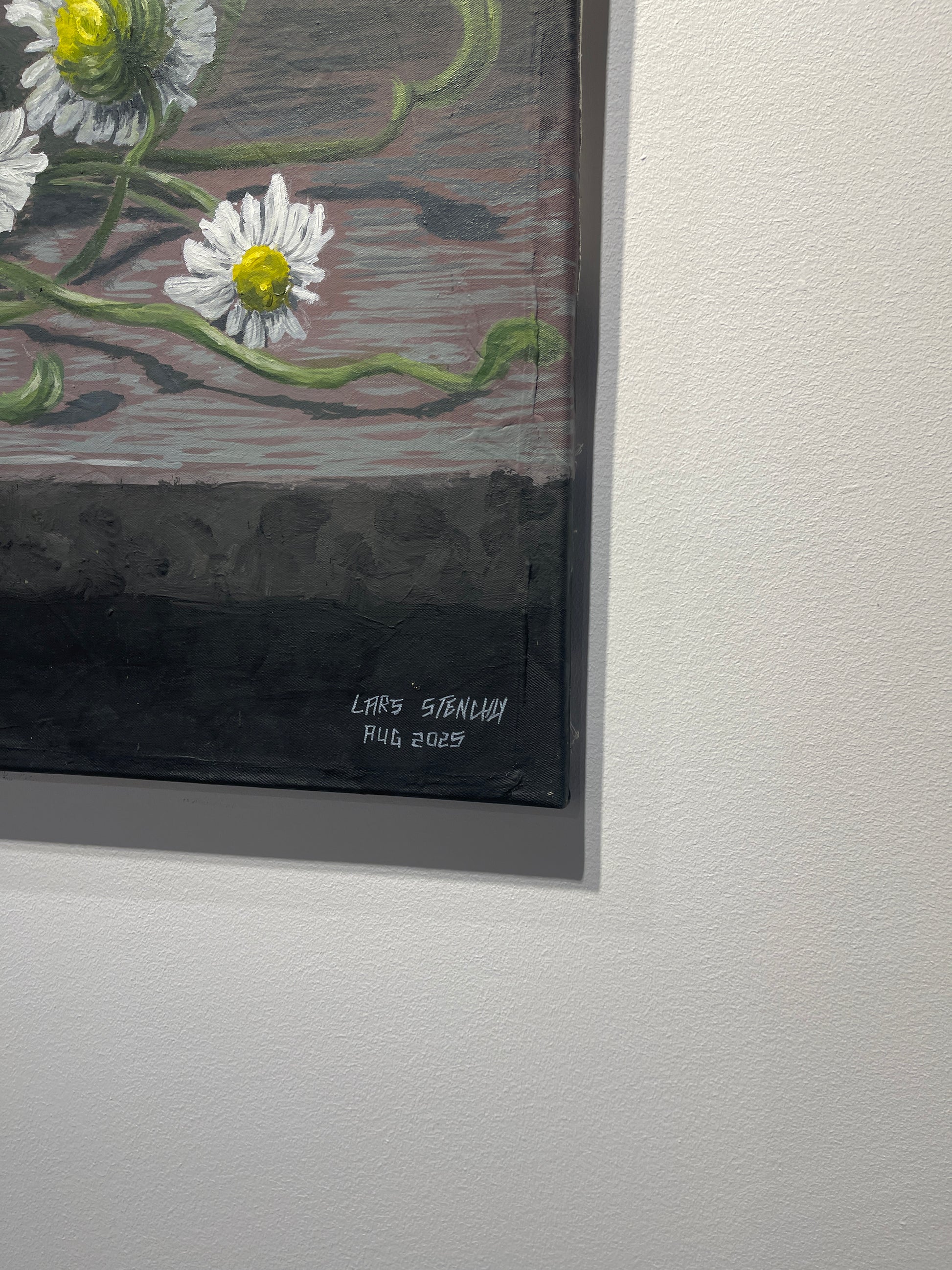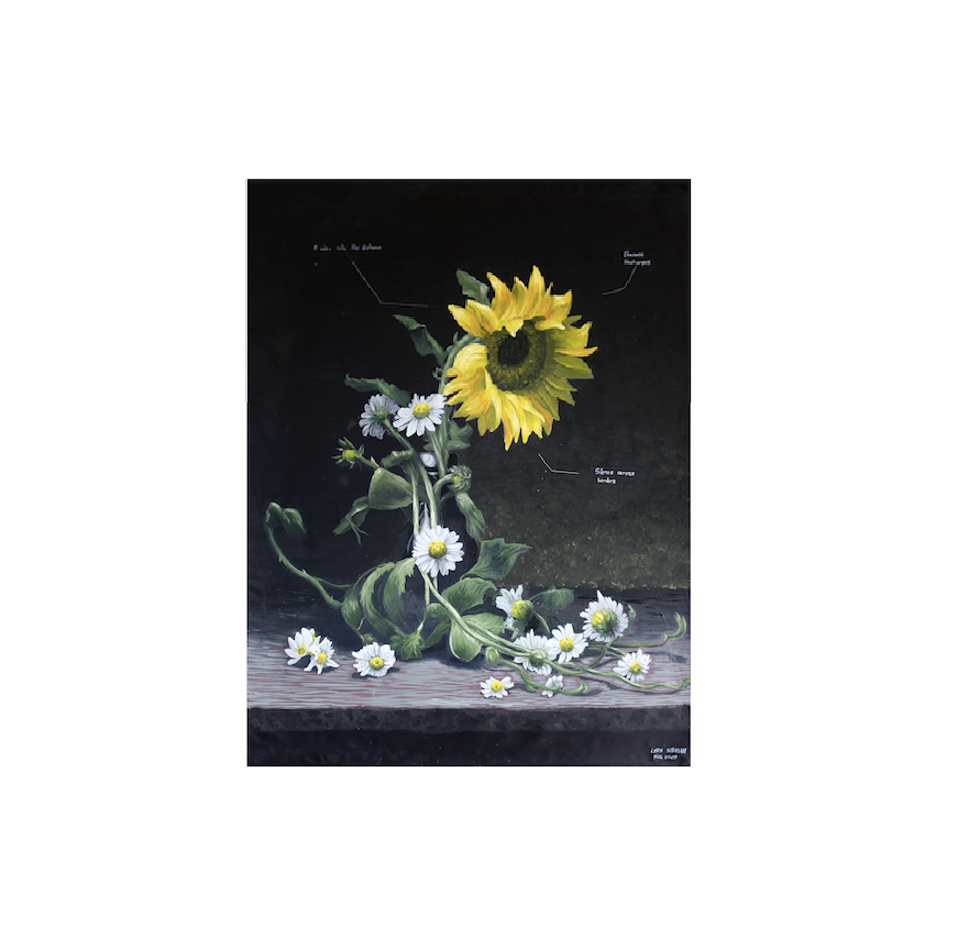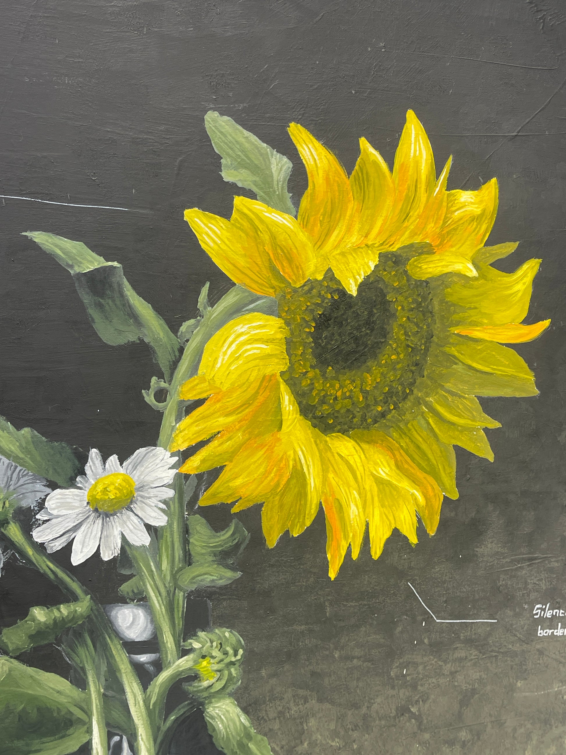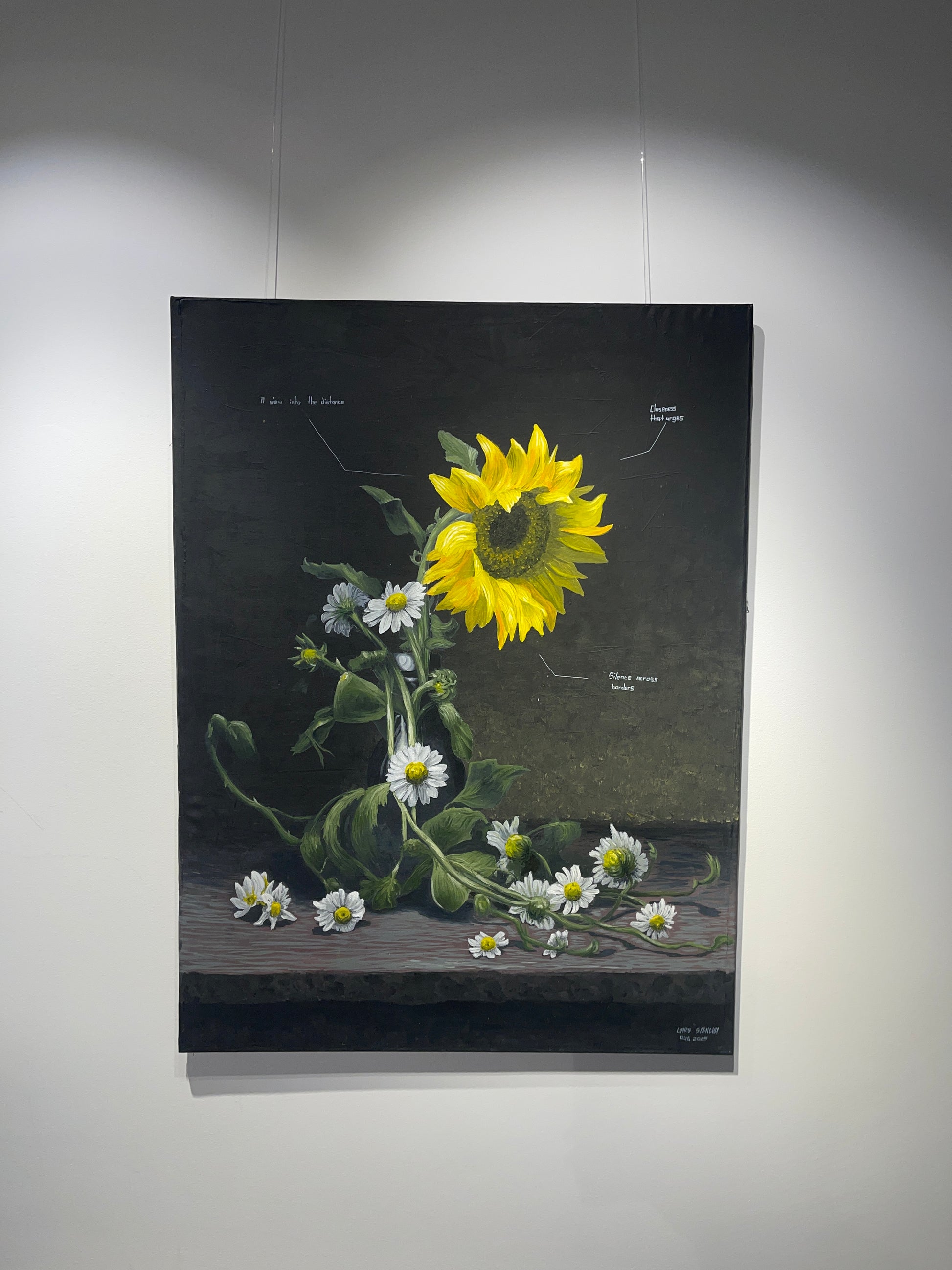Annexion (oil on canvas, 105 x 140 cm) combines political symbolism with poetic condensation. The sunflower, Ukraine's national flower, stands brightly and steadfastly in the center, while chamomile—the symbol of Russia—entwines and engulfs it. It is an image of resistance and threat at the same time, a parable for the loss of freedom and identity.